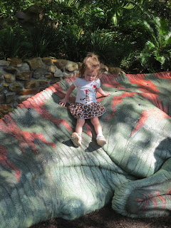 After she plays with the characters for a little while and gets lots of hugs and kisses I tell my toddler it is time to go. We meander slowly out of the Park, stopping to see the fish and otters at play and some of the other animal exhibits on our way out. Alyssa insists on running through the "secret" cave and "hidden" bridge in the Oasis and says good-bye to the anteater and some ducks (the macaws have already gone in for the night).